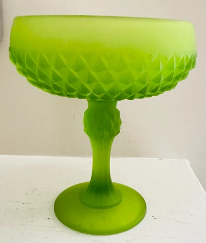 vtg Indiana glass Diamond Point Satin Frosted Green Pedestal Compote 7.25"H