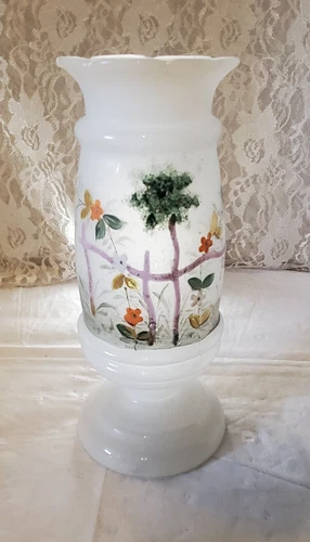 VTG Hand Painted Pedestal Vase Milky Colored Glass Vase With Handpainted Flowers