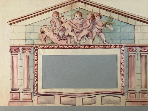 Very Pretty Painting Child Pediment Gouache Paper 1936 Putti Angel Architecture