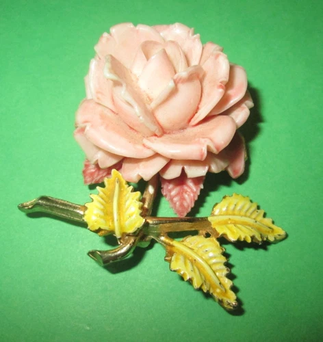 VINTAGE PELL Signed Pink Rose Brooch Pin Mid Century Enamel Leaves Gold Tone