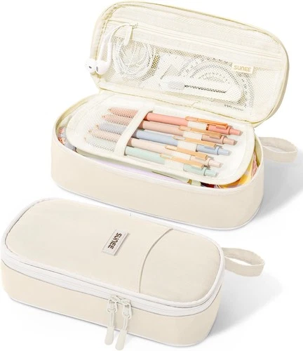 SUNEE Large Capacity Pencil Case with Compartments and Handle, Beige Pen Pouch O