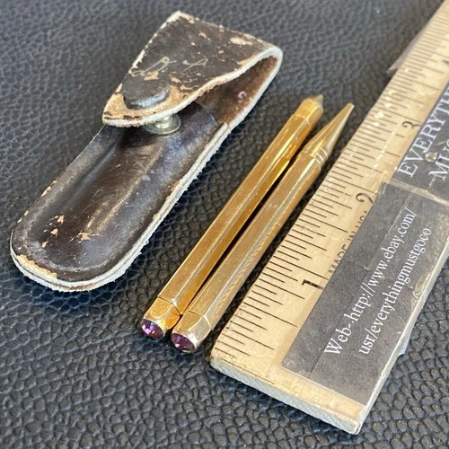 Vtg Mini Gold Pen & Pencil Set Jeweled Faux Pin Diamond Tops Leather Snap Case