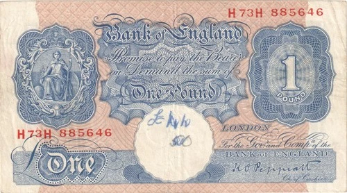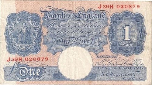 1940 - 1948 Bank of England 1 Pound Banknote - P# 367- Peppiatt - VG - # 36768