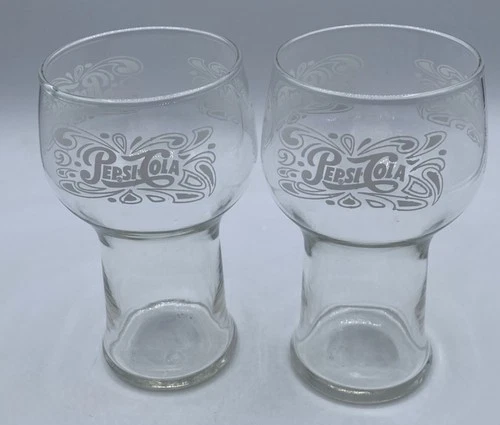 2 Vintage Pepsi Cola Bell Shaped Fountain Glass Tumbler White Scroll Print