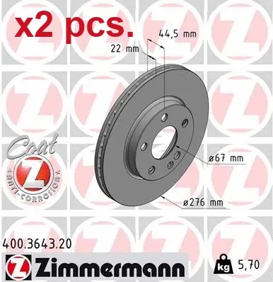 X2 PCS FRONT BRAKE DISC ROTOS X2 PCS SET 400.3643.20 ZIMMERMANN I