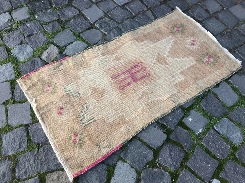 Turkish Vintage Small Rug Handmade Wool Bohemian Bath Mat Rug 1,7 x 3,1 ft