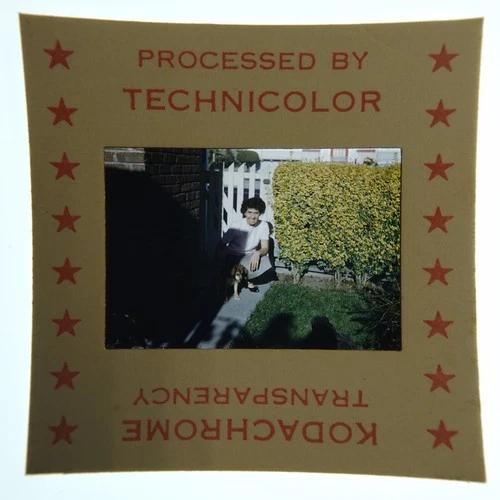 Vintage 1960 KODACHROME Slide Woman & Dog Picket Fence Technicolor Processed