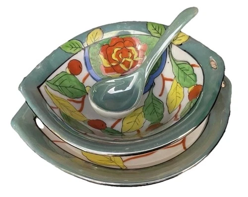 Hand Painted Lusterware Porcelain Dish Set Bowl, Plate & Spoon Floral Japan
