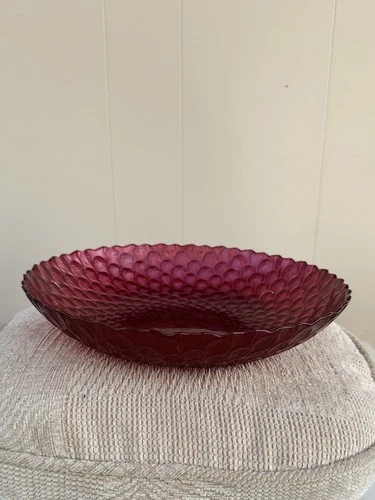 Large Red Glass Bowl Plate Textured Pattern Vintage Style Fruit Dish Centrepiece