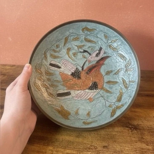 Brass Cloisonné Centerpiece Plate Dish Bowl Birds Vines Turquoise Vintage India