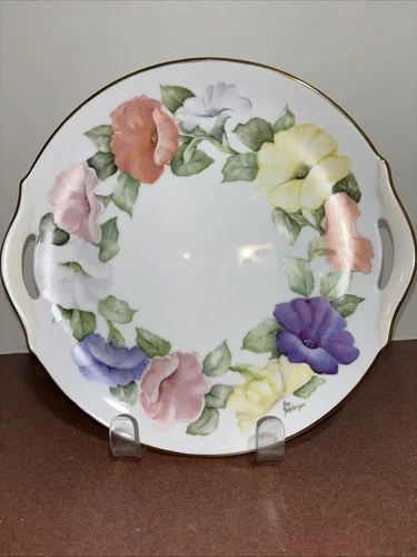 VINTAGE PORCELAIN HAND-PAINTED PETUNIA HANDLED SERVING PLATTER 11” D SIGNED