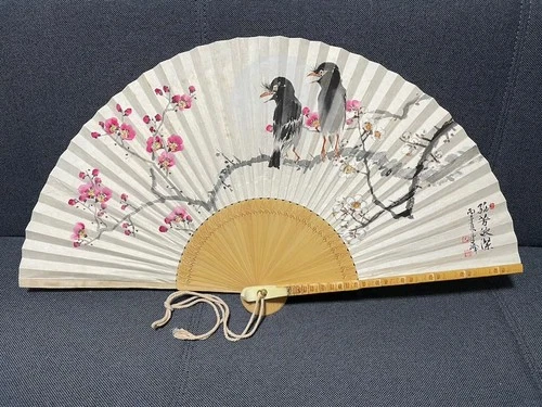 Decorative Folding Fan Plum Blossom Bird Design Artist Signed Sensu