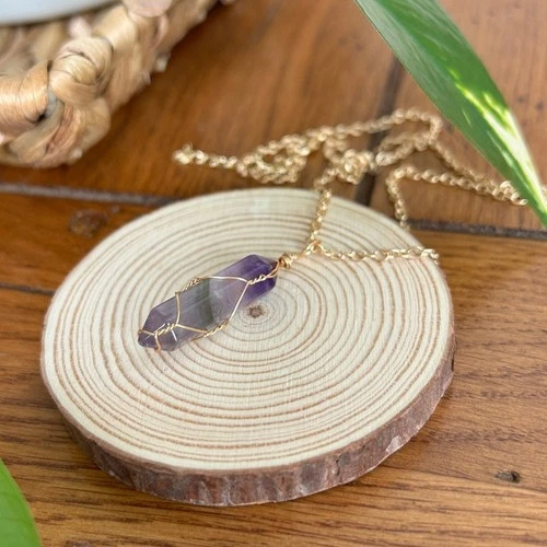 Amethyst Crystal Point Gemstone Wire Wrapped Pendant Necklace Gold Tone Chain