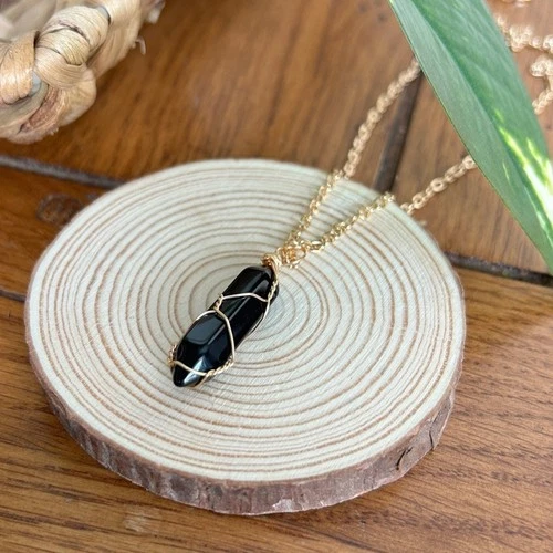 Black Obsidian Crystal Point Pendant Necklace Gold Tone Chain Wire Wrapped