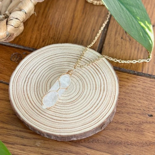 Wire Wrapped White Crystal Quartz Point Necklace Gold Tone Chain Adjustable Boho