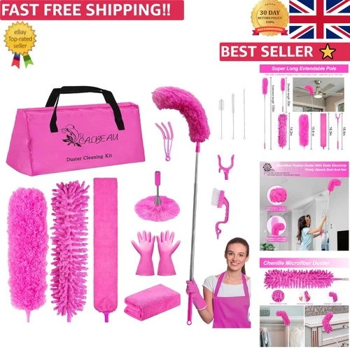 15PCS Microfiber Feather Duster Set with 100-Inch Extension Pole - Pink Elegance