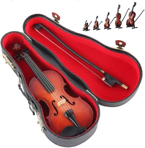 Mini Violin Miniature Musical Instrument Wooden Kits with Support and Case Model