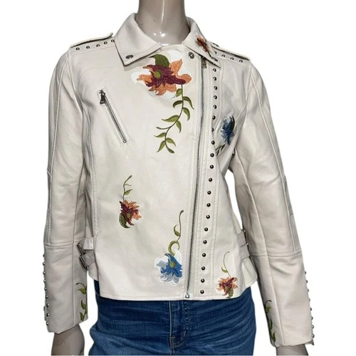 Women's Size XL Cream Ivory Embroidered Flowers Faux Leather Motorcycle Jacket
