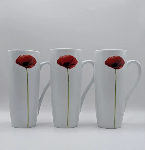 Set of 3 Tall White Poppy Latte Mugs Red Floral Design Fine China