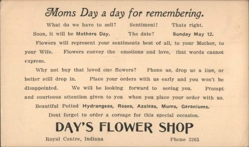 Royal Centre, Indiana Moms Day Flowers Advertisement, Day's Flower Shop 1957