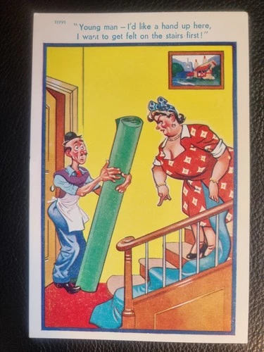 Comic Postcard C1950 Carpet Fitter Fat Lady Lay Felt On Stairs TROW