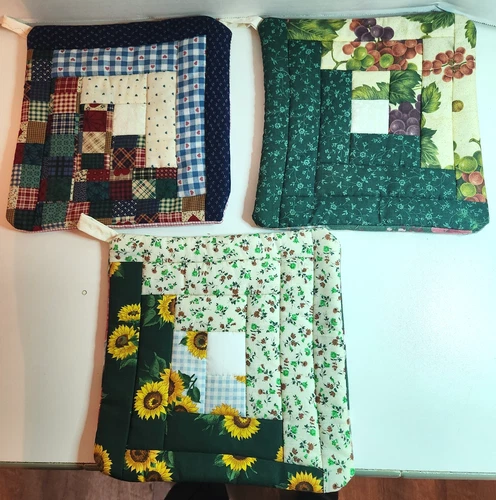 Pretty set of 3 New Potholders Handmade Multicolored squares grapes flowers 9x9"