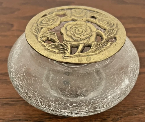 Vintage Clear Crackle Glass Rose Potpourri Jar Bowl Brass Floral Rose Lid India