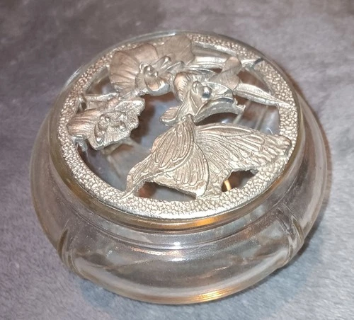 Vintage Potpourri Glass Jar Pewter Lid - Butterfly & Flowers - EUC