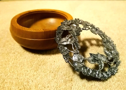 Handmade Potpourri Bowl Pewter Lid Light Wood Turned Floral Metal VTG Pierced