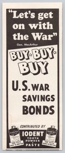 1943 Iodent Tooth Powder Dental Care WWII Buy U. S. War Bonds Vintage Print Ad
