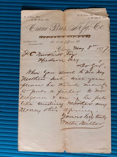 1877 Crane Bros. Mfg Co Chicago Letter | Pre-1880 Industrial Letterhead