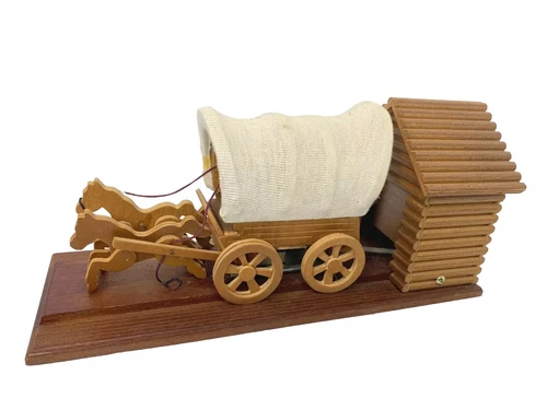 Vintage WOODEN MOVING COVERED WAGON W/ HORSES MUSIC BOX