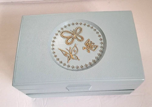 Vintage 1960s 3 Tier Plastic Jewelry Box Blue with Butterflies on Top Pre-owned