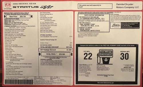 2006 Dodge Stratus SXT Sedan Original Monroney Window Sticker Document Price