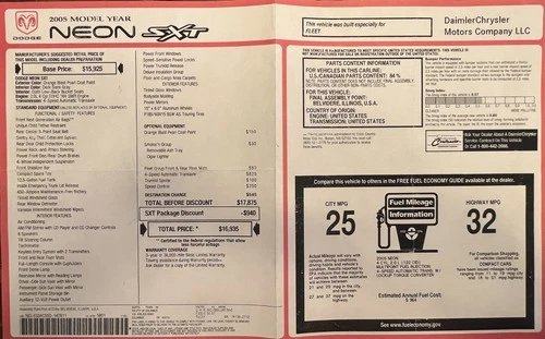 2005 Dodge Neon SXT Original Window Sticker Monroney Label Price Sheet