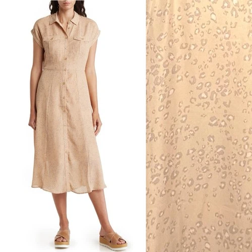 LUCKY BRAND Midi Shirt Dress Beige Button Front Leopard Coastal Brunch Collared