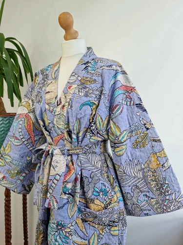 Indian Grey Monkey Kantha Quilt Cotton Kimono Night Winter Suit Kimono Robes US