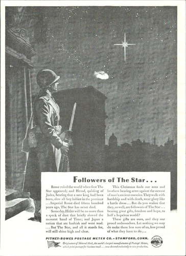 PITNEY BOWES postage meter soldier guard duty CHRISTMAS Star 1943 WWII PRINT AD