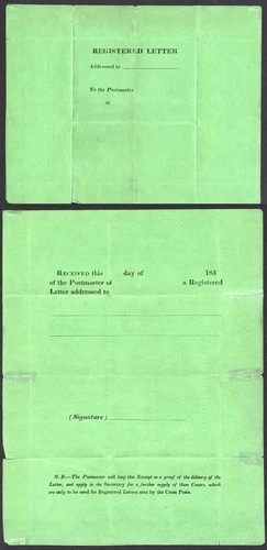 ESSAY or PROOF for the Green Wrappers Registered Letters were enclosed in.