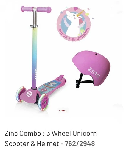 Zinc 3 Wheel Kids Unicorn Scooter Helmet Set | Light-Up Wheels | Adjust | Age 3+