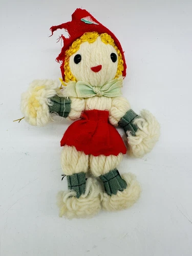 Vintage Japan Yarn Girl Ornament 1950’s Mid Century Cloth Rag 5.5” Scarecrow