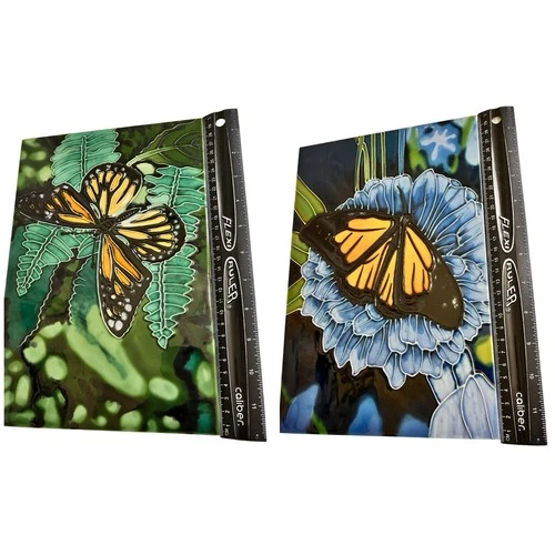 Pair BUTTERFLIES Large Wall Hanging Ceramic Tiles with Stands 12”