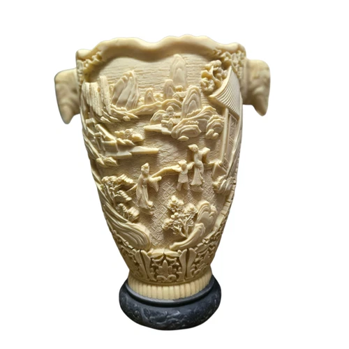 12" Asian Scenic Relief Resin Table Vase Elephant Handles Black Base Decor Beige