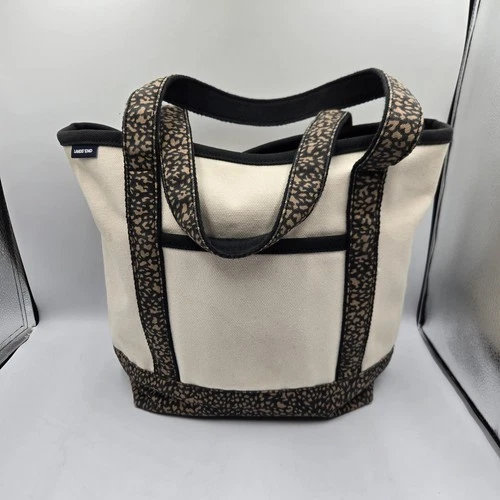 Lands End Canvas 4 Pocket Tote Shoulder Bag Ivory w/ Cheetah Leopard Print READ
