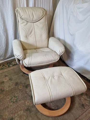 PCL Collection Bent Wood Swivel Cream Leatherette Reclining Chair + Pouffe