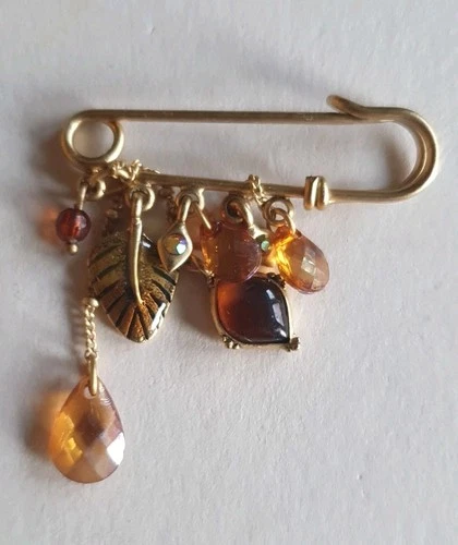 Gold Tone Kilt Pin Brooch with Filigree Amber Glass And Leaf Charms Teardrops