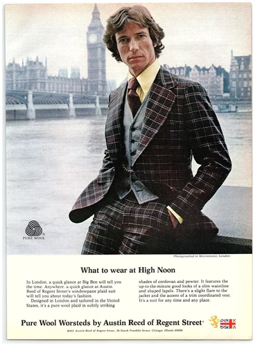 1973 Pure Wool Worsteds Austin Reed of Regent Street Print Ad, Big Ben London
