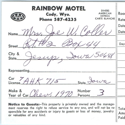 1975 Cody, Wyoming Rainbow Motel Registration Receipt Ephemera Vtg Hotel 2B