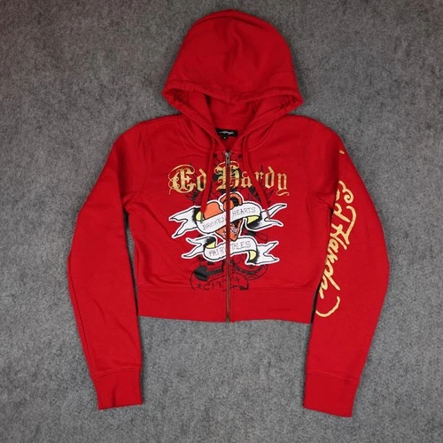 Ed Hardy Hoodie Womens Medium Red Broken Hearts Tattoo Full Zip Cropped VTG Y2K