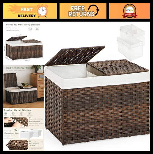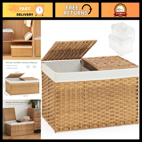 Woven Storage Basket with Lid, 17.2 Gallon, Foldable, 2 Removable Liners, Handle